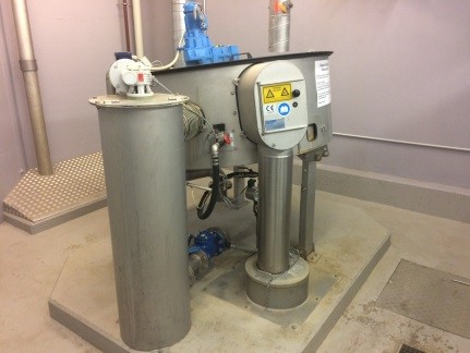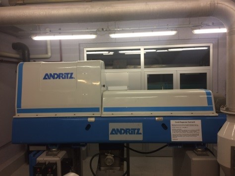 - La déshydratation : Les boues ayant produit tout leur gaz lors de la digestion, elles sont ensuite amenées dans un stockeur. De là, elles sont pompées vers la centrifugeuse. Au travers de cet équipement, leur siccité va passer d’environ 4% à environ 30% de matières sèches. Ce phénomène est possible grâce à l’ajout de polymère. L’eau produite par cette opération est amenée vers le SBR (traitement des retours).Les boues déshydratées sont transportées dans des bennes et seront ensuite amenées vers une usine d’incinération.