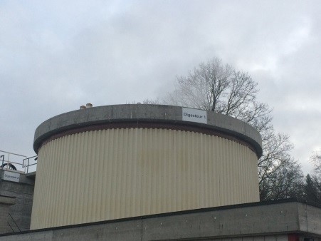 - La digestion : Comme indiqué précédemment, les boues sont stabilisées. Pour ce faire, elles sont envoyées après épaississement dans le digesteur 1. A l’aide d’une recirculation et d’un échangeur de chaleur, les boues sont chauffées à environ 38°C et sont ensuite dirigées vers le digesteur 2. Durant cette phase de digestion, les boues produisent du biogaz.
