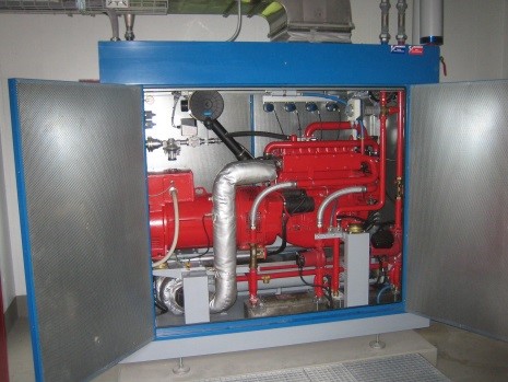 - Le couplage chaleur force CCF : Comme indiqué lors de la phase de digestion des boues, celles-ci produisent du biogaz qui est stocké dans un gazomètre, et qui est ensuite utilisé pour alimenter le CCF. Ce dernier produit une puissance électrique de 40 KW et une puissance thermique de 70 KW. L’énergie électrique est réintroduite dans le réseau et l’énergie thermique est utilisée pour le chauffage du digesteur et des bâtiments.