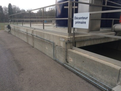 - Le décanteur primaire : 2 bassins de type rectangulaires permettant la décantation des boues, une fois ces dernières déposées au fond du bassin, elles sont raclées vers une trémie d'où elles sont extraites. Un racleur à chaîne permet un raclage en fond de bassin et en surface.