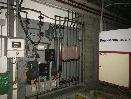 - Poste de déphosphatation : Cette installation a pour but de piéger les phosphates, mais sert également à améliorer la décantabilité des boues en favorisant la formation de flocs. Le produit utilisé est du chlorosulfate de fer (FeCl3).